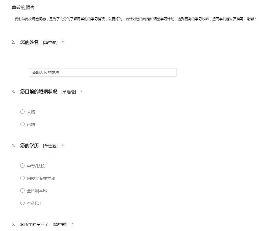 我们做此次调查问卷,是为了充分的了解同学们的学习情况,以更好的、有针对性的制定和调整学习计划,达到更高的学习效率,望同学们能认真填写,谢谢!
