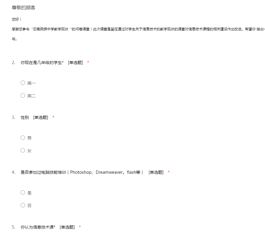 您好!感谢您参与“云南民族中学教学现状“的问卷调查!此次调查是旨在通过对学生关于信息技术的教学现状的调查对信息技术课程的相关建设作出改进。希望你 抽出一点时间积极配合我的调查工作,谢谢您的参与。