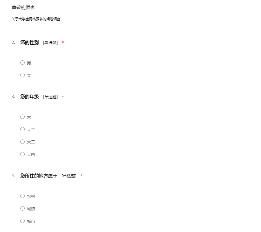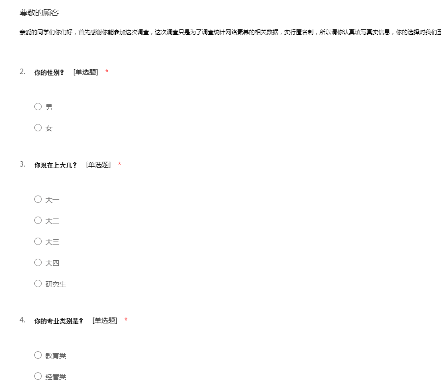 亲爱的同学们你们好,首先感谢你能参加这次调查,这次调查只是为了调查统计网络素养的相关数据,实行匿名制,所以请你认真填写真实信息,你的选择对我们至关重要,再次谢谢您的配合!