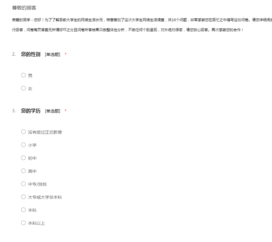 亲爱的同学:您好!为了了解目前大学生的网络生活状况,特意策划了这次大学生网络生活调查,共16个问题,非常感谢您在百忙之中填写这份问卷。请您详细阅读每一道题,再根据您自己的情况对每一道题进行回答,问卷每页答案无所谓好坏之分且问卷所答结果只做整体性分析,不做任何个别呈现,对外绝对保密,请您放心回答。再次感谢您的合作!