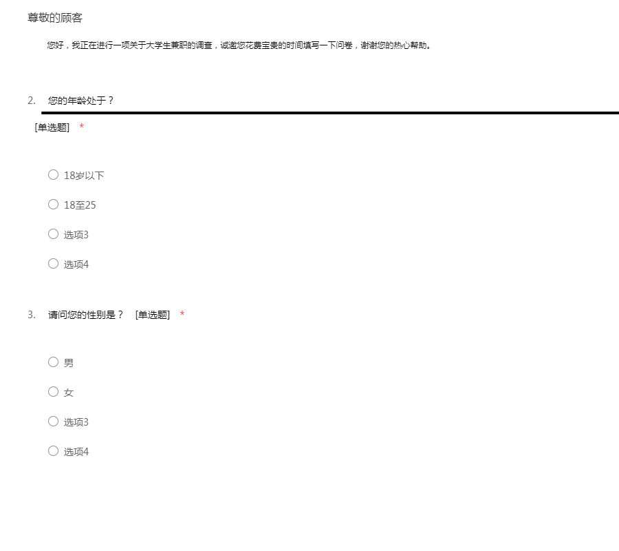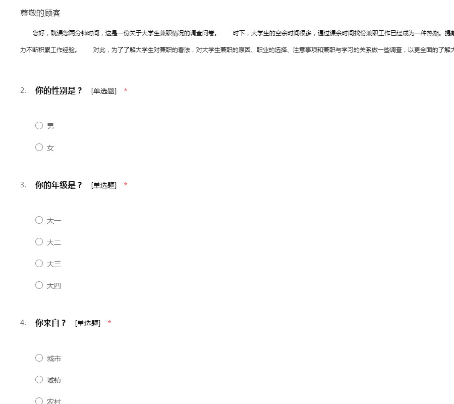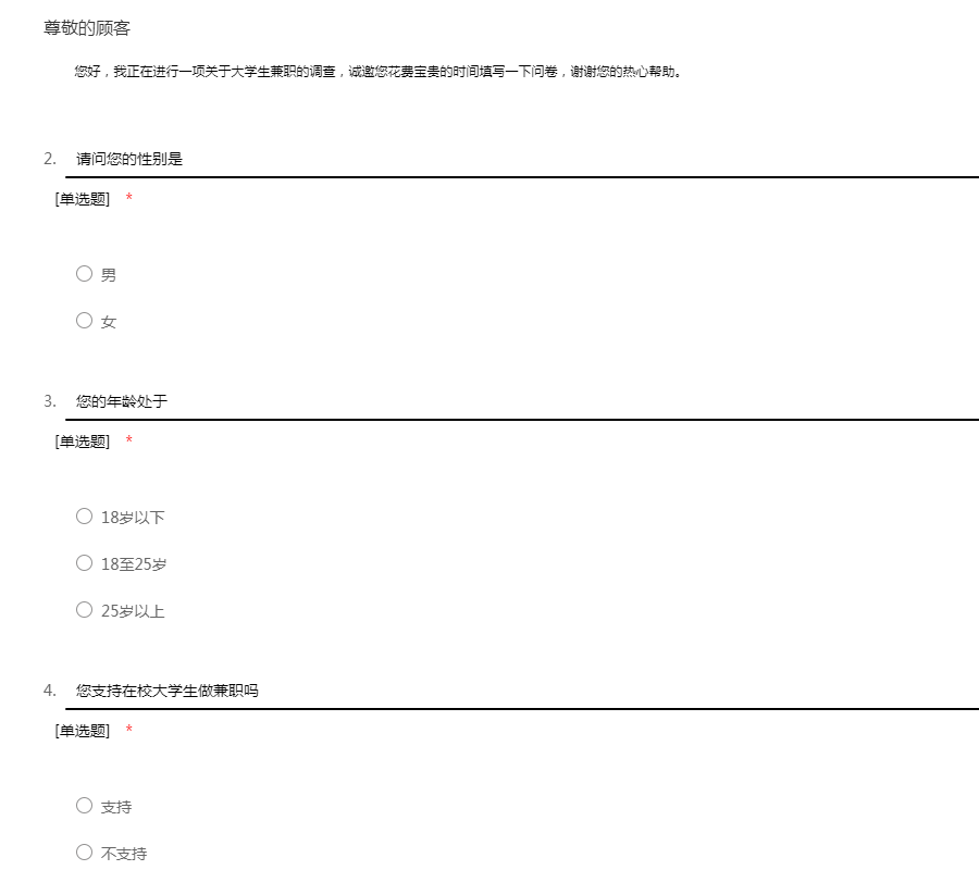 您好,我正在进行一项关于大学生兼职的调查,诚邀您花费宝贵的时间填写一下问卷,谢谢您的热心帮助。