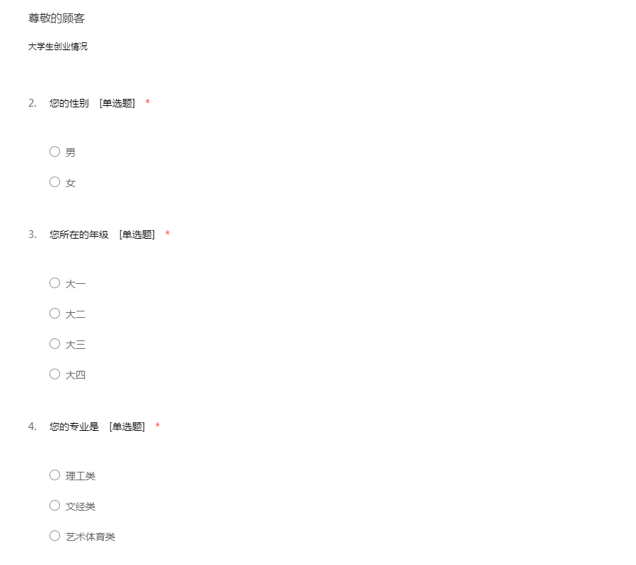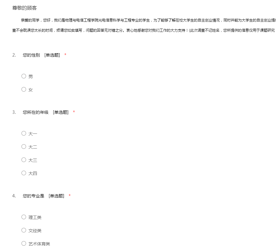 亲爱的同学,您好,我们是物理与电信工程学院光电信息科学与工程专业的学生,为了能够了解在校大学生的自主创业情况,同时并能为大学生的自主创业提供一些有价值的建议,特进行此次调查。此次调查不会耽误您太长的时间,烦请您如实填写,问题的回答无对错之分。衷心地感谢您对我们工作的大力支持!(此次调查不记姓名,您所提供的信息仅用于课题研究,绝不会向任何第三方泄露)
