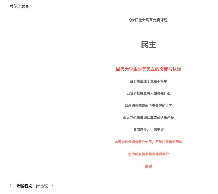 创e杯社会调研竞赛课题 民主 当代大学生对于民主的态度与认知 我们知道这个课题不简单 但我们觉得总有人该做些什么 如果您也期待那个更美好的世界 那么我们恳请您认真完成这份问卷 共同思考,中国更好 本调查仅供调查研究使用,不做任何商业用途 您的所有信息都会得到保护 感谢