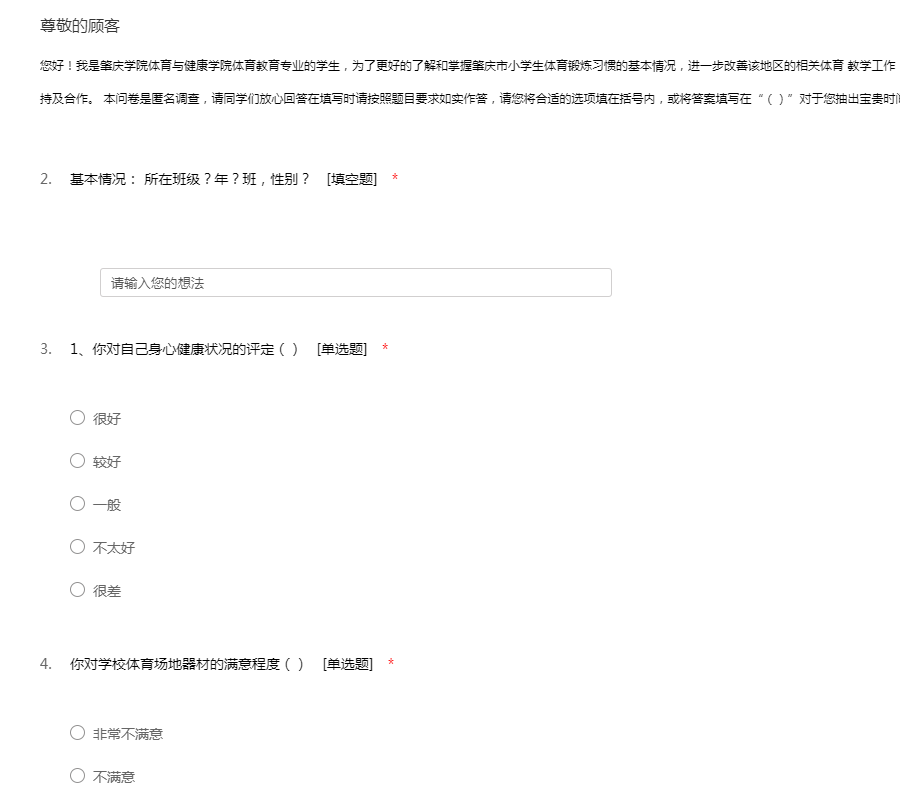 您好!我是肇庆学院体育与健康学院体育教育专业的学生,为了更好的了解和掌握肇庆市小学生体育锻炼习惯的基本情况,进一步改善该地区的相关体育 教学工作,特设计此调查问卷,希望同学们给予大力的支持及合作。 本问卷是匿名调查,请同学们放心回答在填写时请按照题目要求如实作答,请您将合适的选项填在括号内,或将答案填写在“()”对于您抽出宝贵时间给予的支持,我由衷地表示感谢!