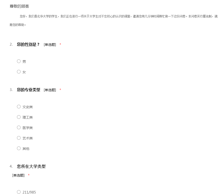 您好,我们是北华大学的学生,我们正在进行一项关于大学生对不忘初心的认识的调查,邀请您用几分钟时间帮忙做一下这份问卷。本问卷实行匿名制,请您放心填写。请您按照自己的实际情况填写,谢谢您的帮助。