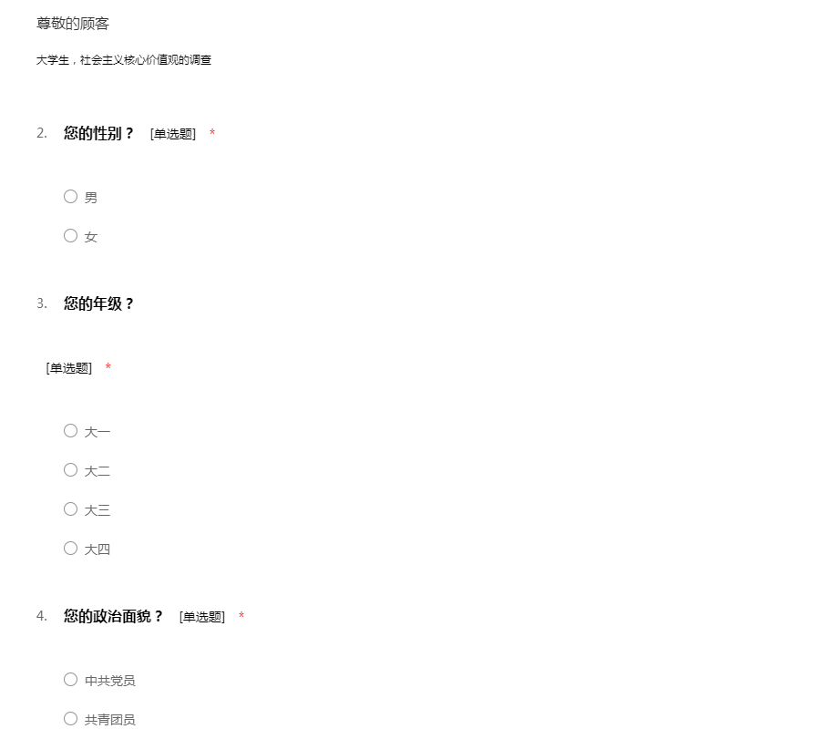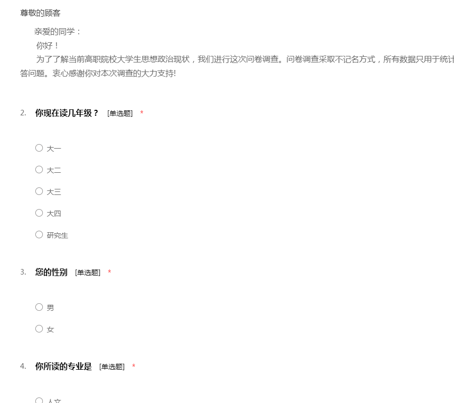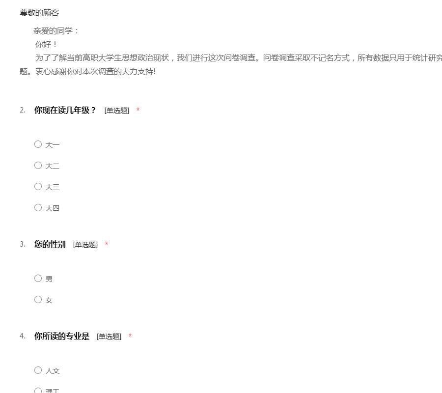 亲爱的同学:你好!为了了解当前高职院校大学生思想政治现状,我们进行这次问卷调查。问卷调查采取不记名方式,所有数据只用于统计研究。请按实际情况和真实想法回答问题。衷心感谢你对本次调查的大力支持!