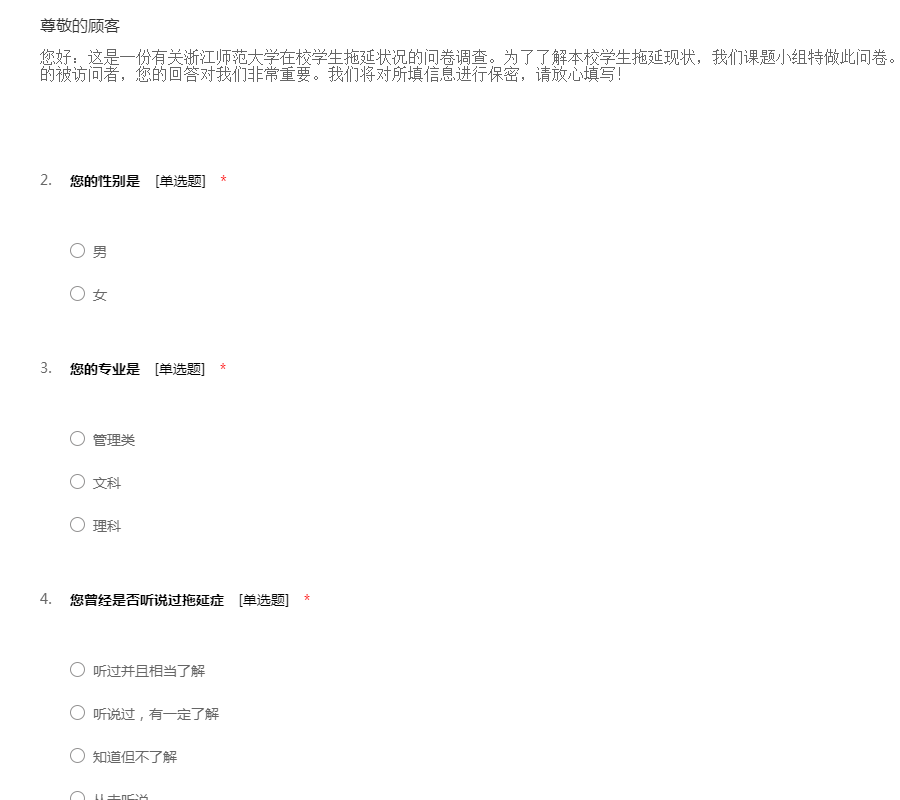 您好:这是一份有关浙江师范大学在校学生拖延状况的问卷调查。为了了解本校学生拖延现状,我们课题小组特做此问卷。您是我们从广大学子中随机挑选到的被访问者,您的回答对我们非常重要。我们将对所填信息进行保密,请放心填写!