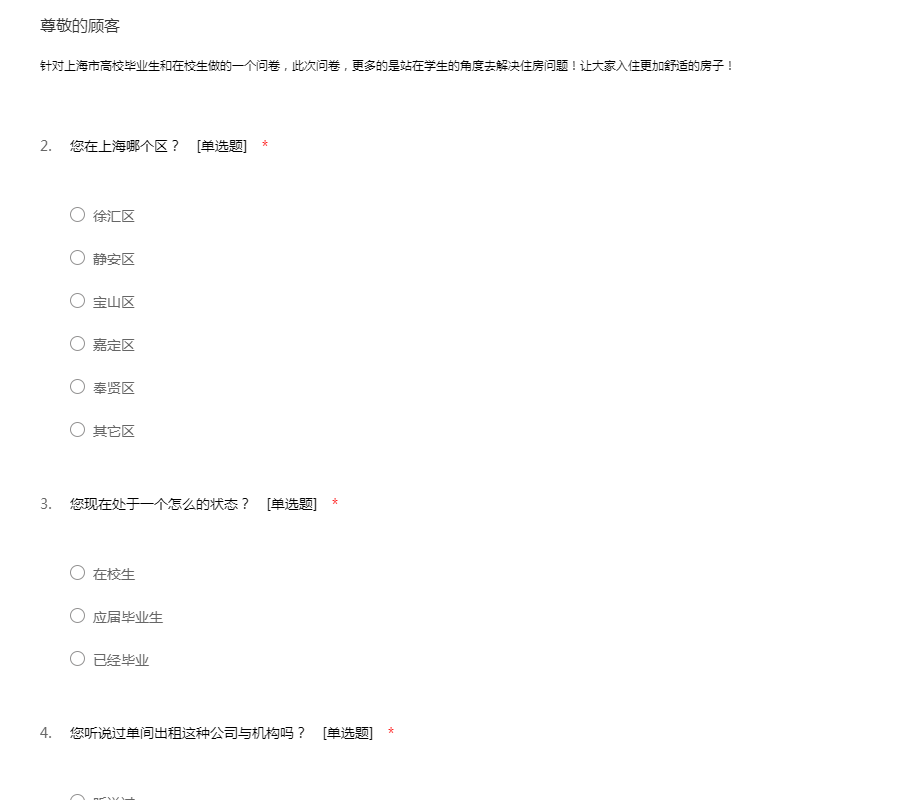 针对上海市高校毕业生和在校生做的一个问卷,此次问卷,更多的是站在学生的角度去解决住房问题!让大家入住更加舒适的房子!