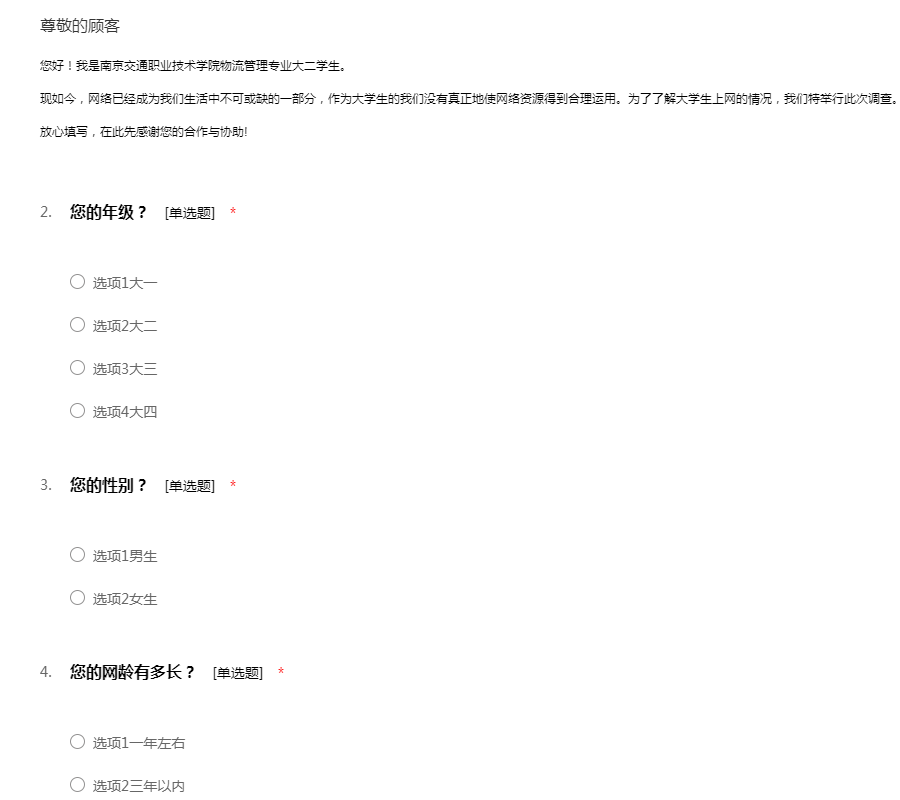 您好!我是南京交通职业技术学院物流管理专业大二学生。现如今,网络已经成为我们生活中不可或缺的一部分,作为大学生的我们没有真正地使网络资源得到合理运用。为了了解大学生上网的情况,我们特举行此次调查。我们对您填写的任何内容都会进行保密,请你们放心填写,在此先感谢您的合作与协助!