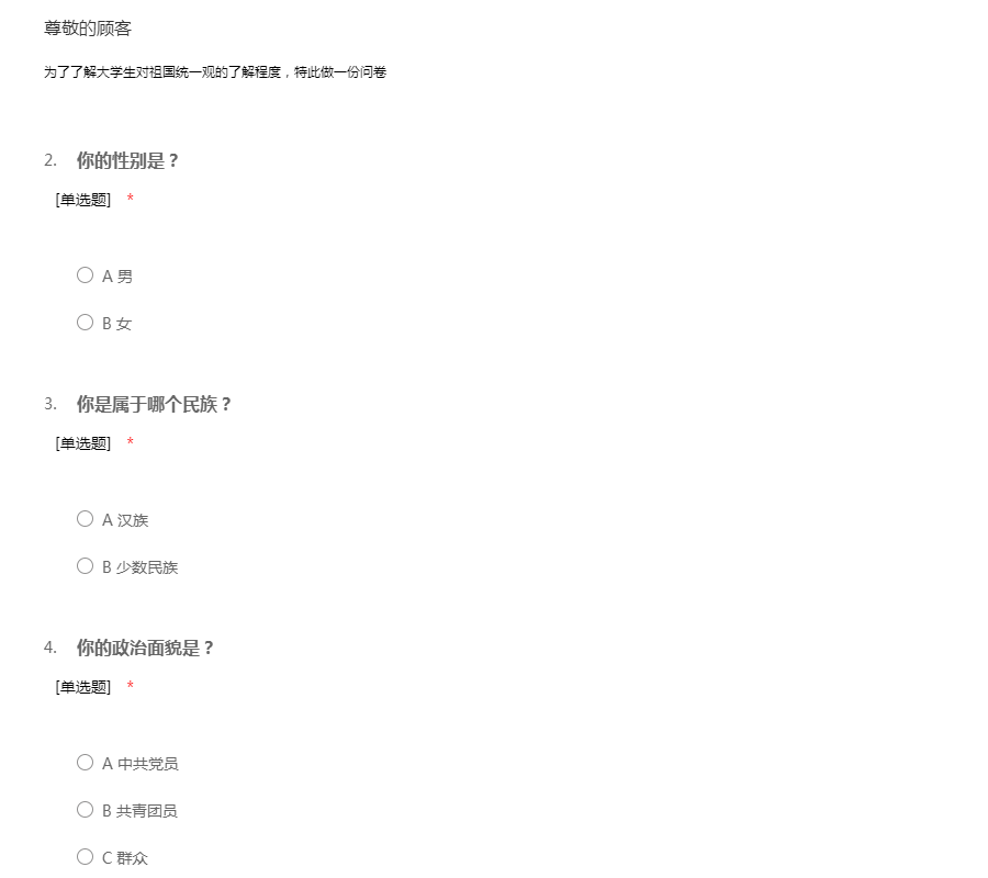 为了了解大学生对祖国统一观的了解程度,特此做一份问卷