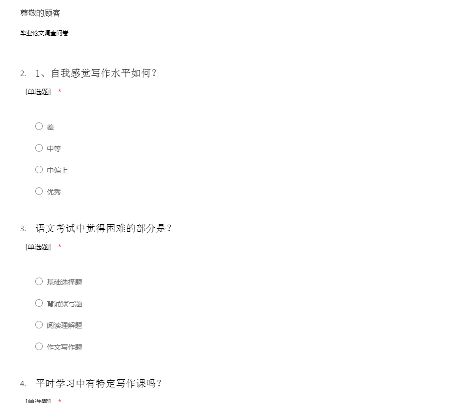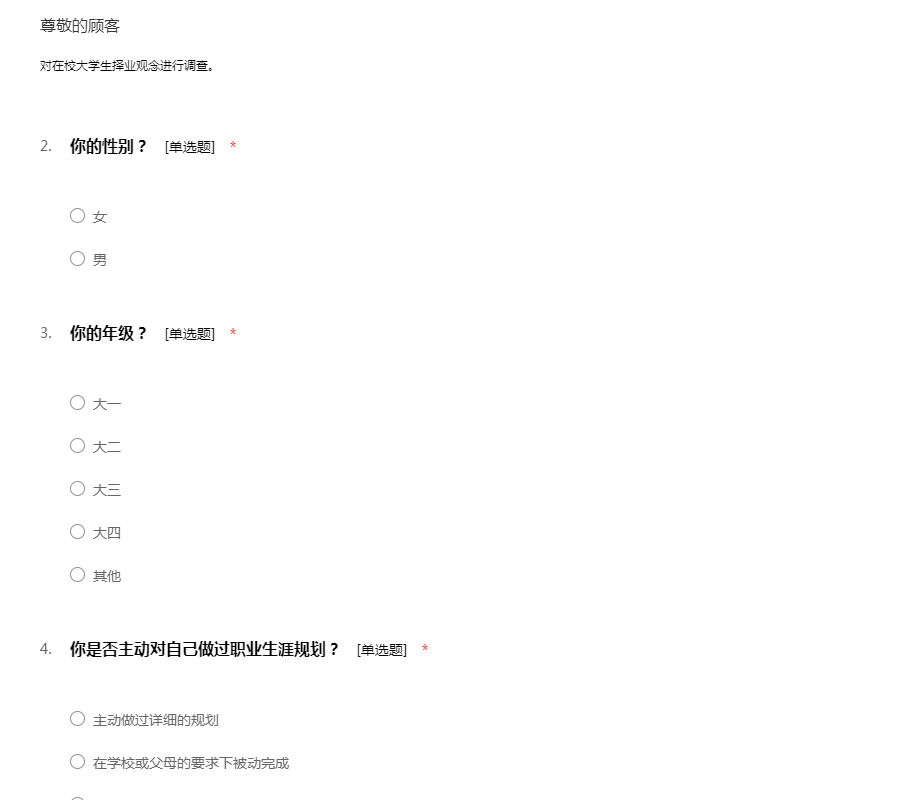 为了全面了解我校翻译学院研究生职业期望和就业准备情况,特进行此次问卷调查。问卷数据仅供学术研究用,恳请您如实填写问卷,衷心感谢您为此付出的时间和精力!