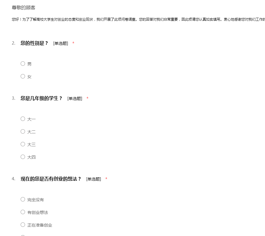 您好!为了了解高校大学生对创业的态度和创业现状,我们开展了此项问卷调查。您的回答对我们非常重要,因此烦请您认真如实填写。衷心地感谢您对我们工作的大力支持!