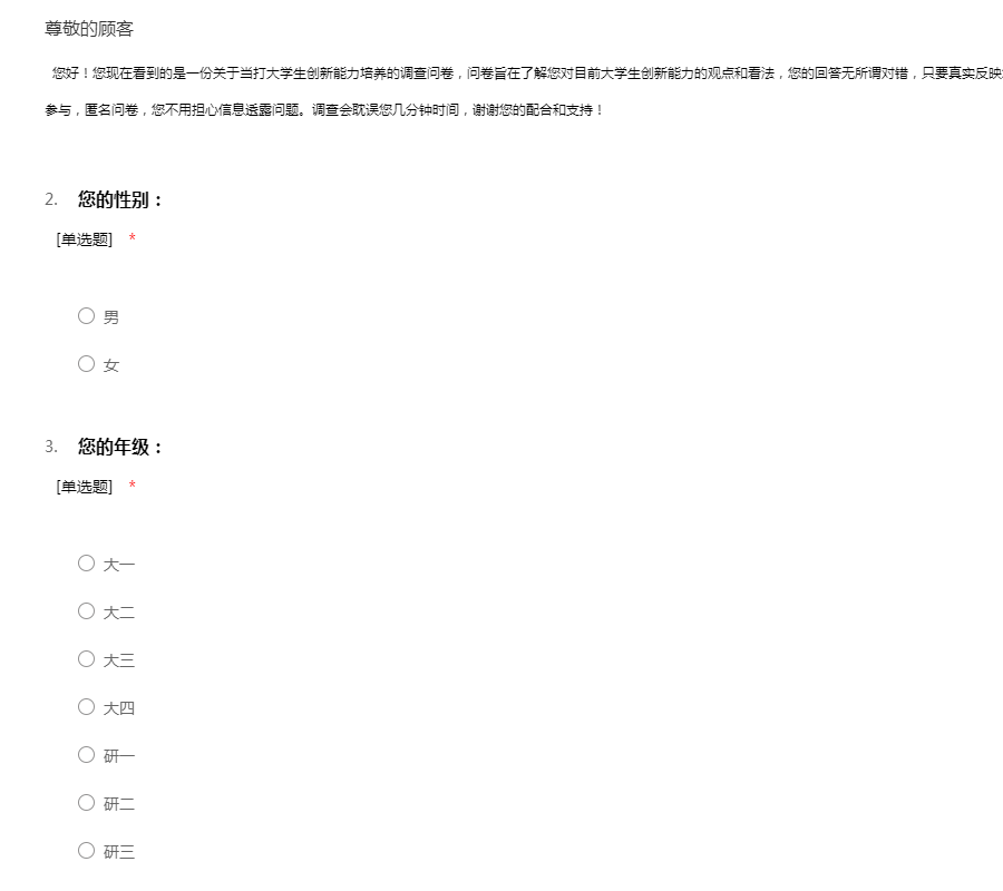 您好!您现在看到的是一份关于当打大学生创新能力培养的调查问卷,问卷旨在了解您对目前大学生创新能力的观点和看法,您的回答无所谓对错,只要真实反映您的想法就能达到这次调查的目的。希望您积极参与,匿名问卷,您不用担心信息透露问题。调查会耽误您几分钟时间,谢谢您的配合和支持!