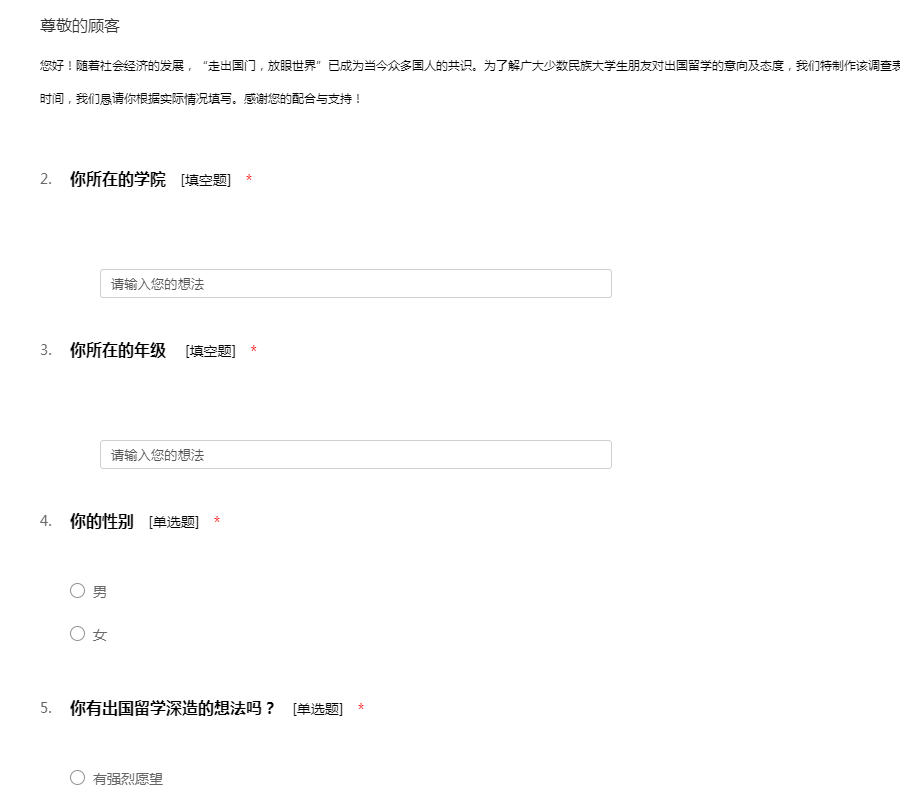 您好!随着社会经济的发展,“走出国门,放眼世界”已成为当今众多国人的共识。为了解广大少数民族大学生朋友对出国留学的意向及态度,我们特制作该调查表开展本次调查工作。本问卷将会耽搁你一些宝贵时间,我们恳请你根据实际情况填写。感谢您的配合与支持!