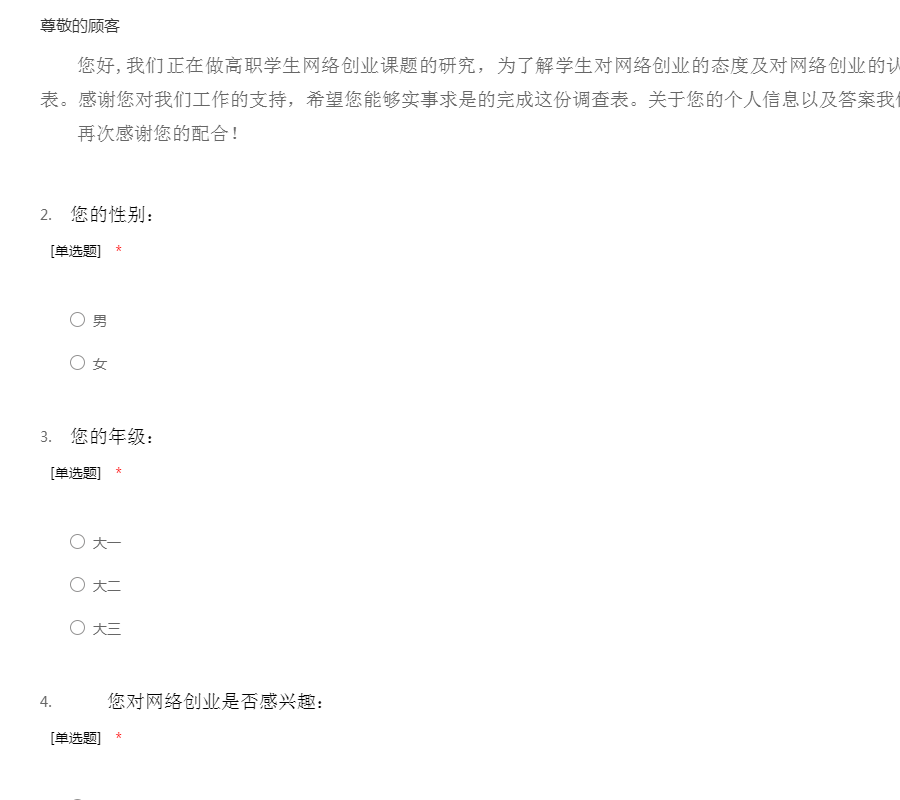 您好,我们正在做高职学生网络创业课题的研究,为了解学生对网络创业的态度及对网络创业的认识,我们特地制作了这份调查表。感谢您对我们工作的支持,希望您能够实事求是的完成这份调查表。关于您的个人信息以及答案我们在此承诺不会告知他人。再次感谢您的配合!