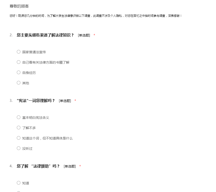 您好!耽误您几分钟的时间,为了解大学生法律意识做以下调查,此调查不涉及个人隐私,对您在百忙之中抽时间参与调查,深表感谢!