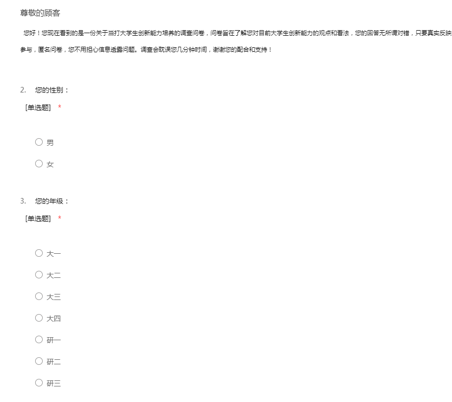 您好!您现在看到的是一份关于当打大学生创新能力培养的调查问卷,问卷旨在了解您对目前大学生创新能力的观点和看法,您的回答无所谓对错,只要真实反映您的想法就能达到这次调查的目的。希望您积极参与,匿名问卷,您不用担心信息透露问题。调查会耽误您几分钟时间,谢谢您的配合和支持!