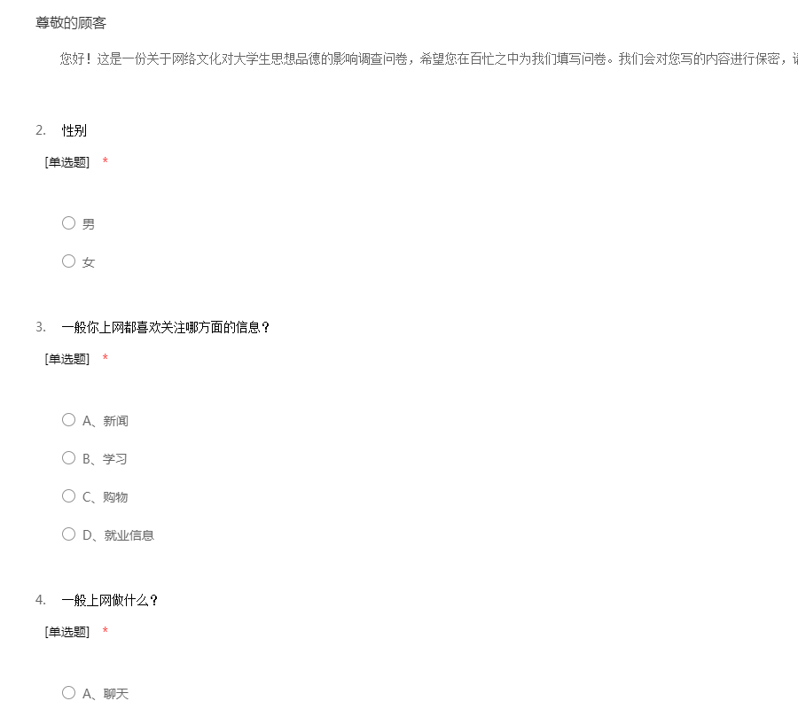 您好!这是一份关于网络文化对大学生思想品德的影响调查问卷,希望您在百忙之中为我们填写问卷。我们会对您写的内容进行保密,请放心填写,谢谢合作