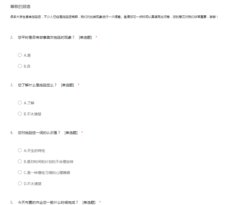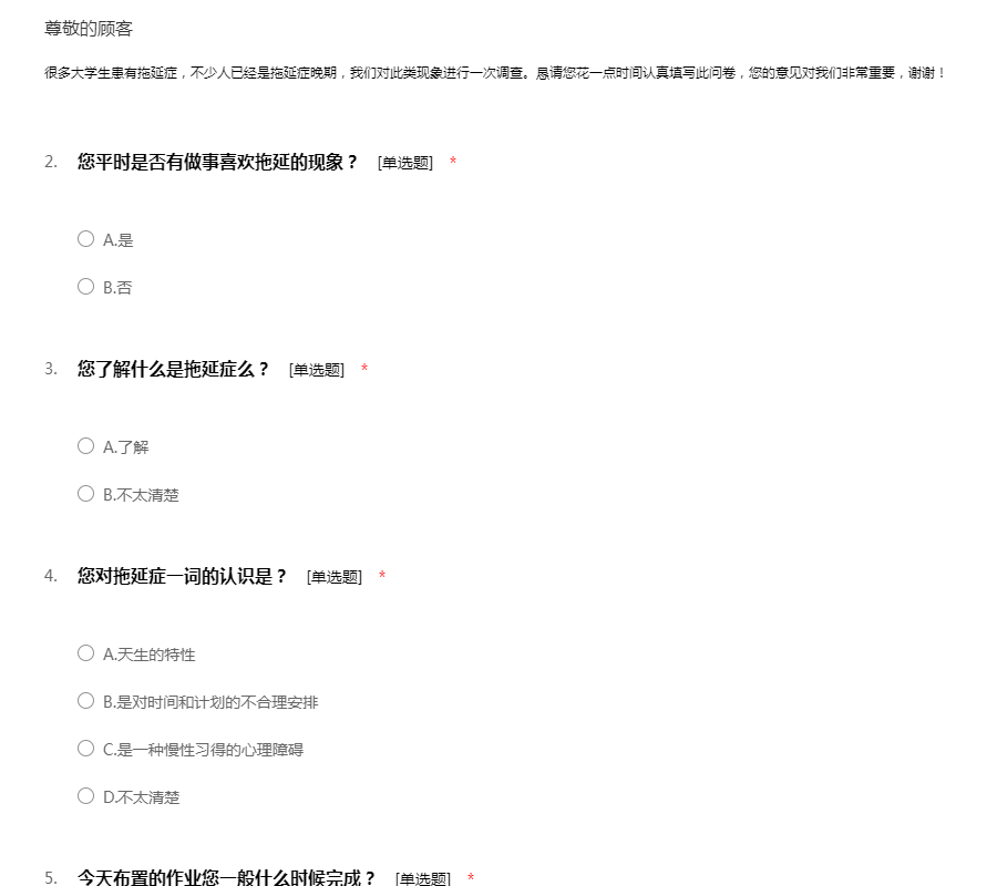 很多大学生患有拖延症,不少人已经是拖延症晚期,我们对此类现象进行一次调查。恳请您花一点时间认真填写此问卷,您的意见对我们非常重要,谢谢!