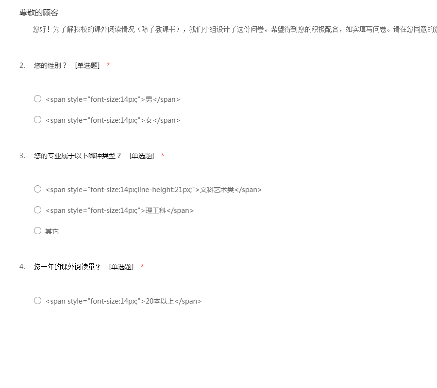 您好!为了解我校的课外阅读情况(除了教课书),我们小组设计了这份问卷。希望得到您的积极配合,如实填写问卷。请在您同意的选项上直接打“√”,谢谢!