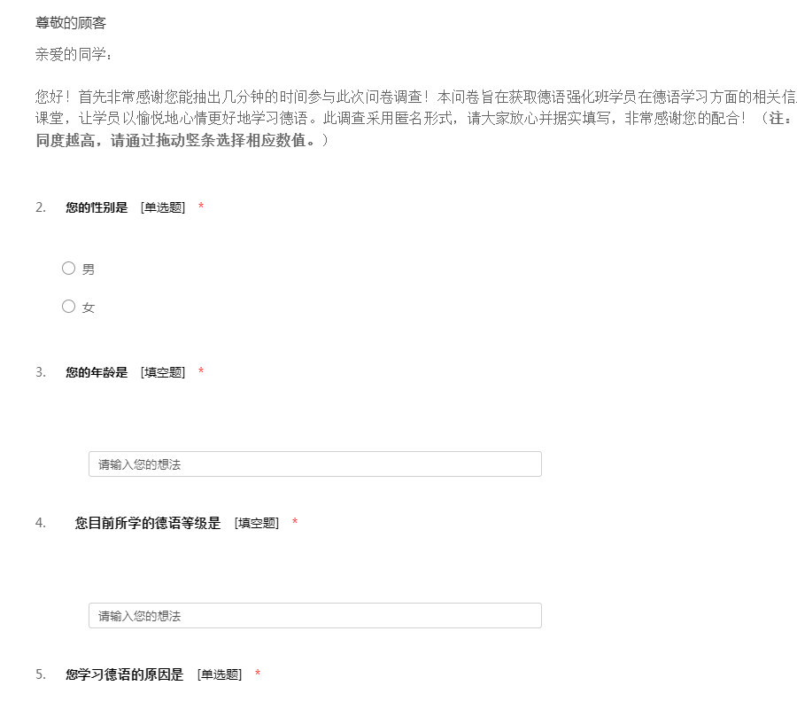 亲爱的同学: 您好!首先非常感谢您能抽出几分钟的时间参与此次问卷调查!本问卷旨在获取德语强化班学员在德语学习方面的相关信息,用于研究分析,以便更好地设计课堂,让学员以愉悦地心情更好地学习德语。此调查采用匿名形式,请大家放心并据实填写,非常感谢您的配合!(注:第5题-第33题,数值越大,表示赞同度越高,请通过拖动竖条选择相应数值。)