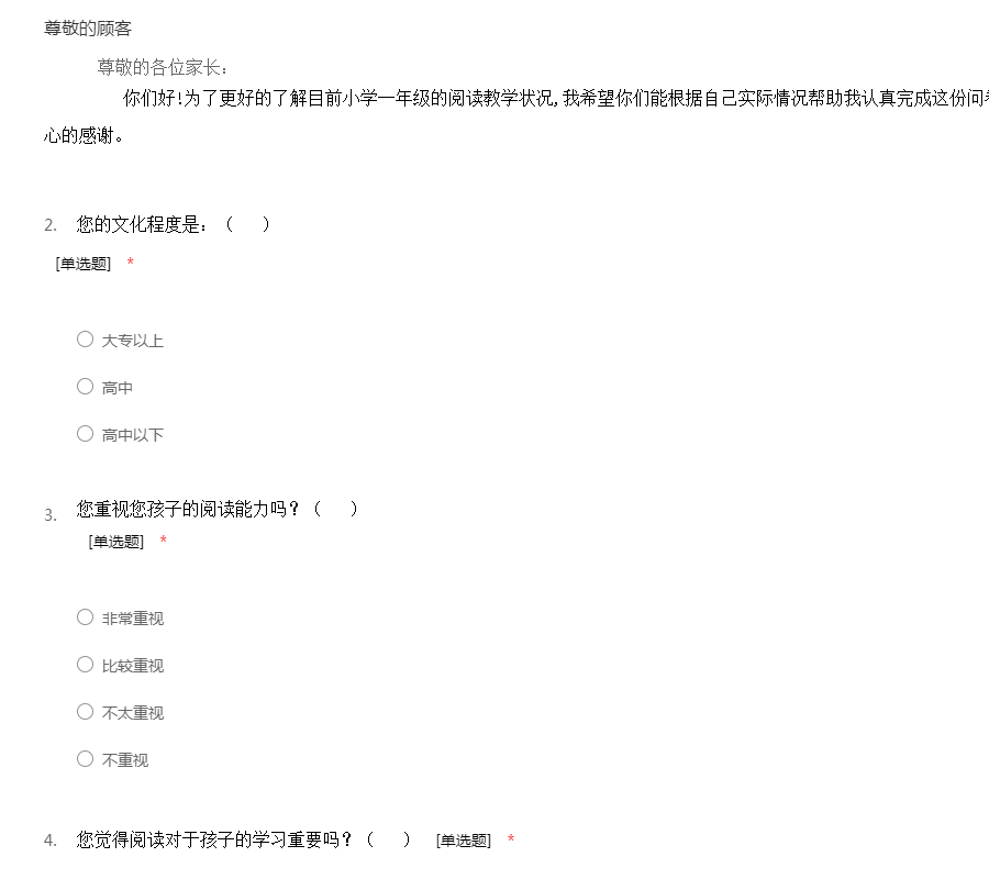 尊敬的各位家长: 你们好!为了更好的了解目前小学一年级的阅读教学状况,我希望你们能根据自己实际情况帮助我认真完成这份问卷,对于你们的支持和配合,我表示衷心的感谢。