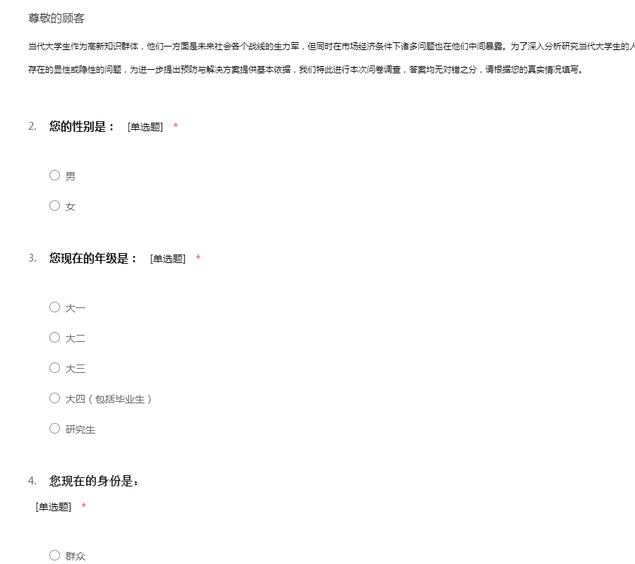 当代大学生作为高新知识群体,他们一方面是未来社会各个战线的生力军,但同时在市场经济条件下诸多问题也在他们中间暴露。为了深入分析研究当代大学生的人生追求与价值信仰问题,初步了解当代大学生中存在的显性或隐性的问题,为进一步提出预防与解决方案提供基本依据,我们特此进行本次问卷调查,答案均无对错之分,请根据您的真实情况填写。