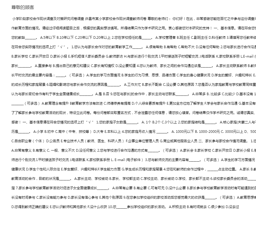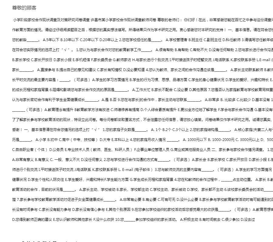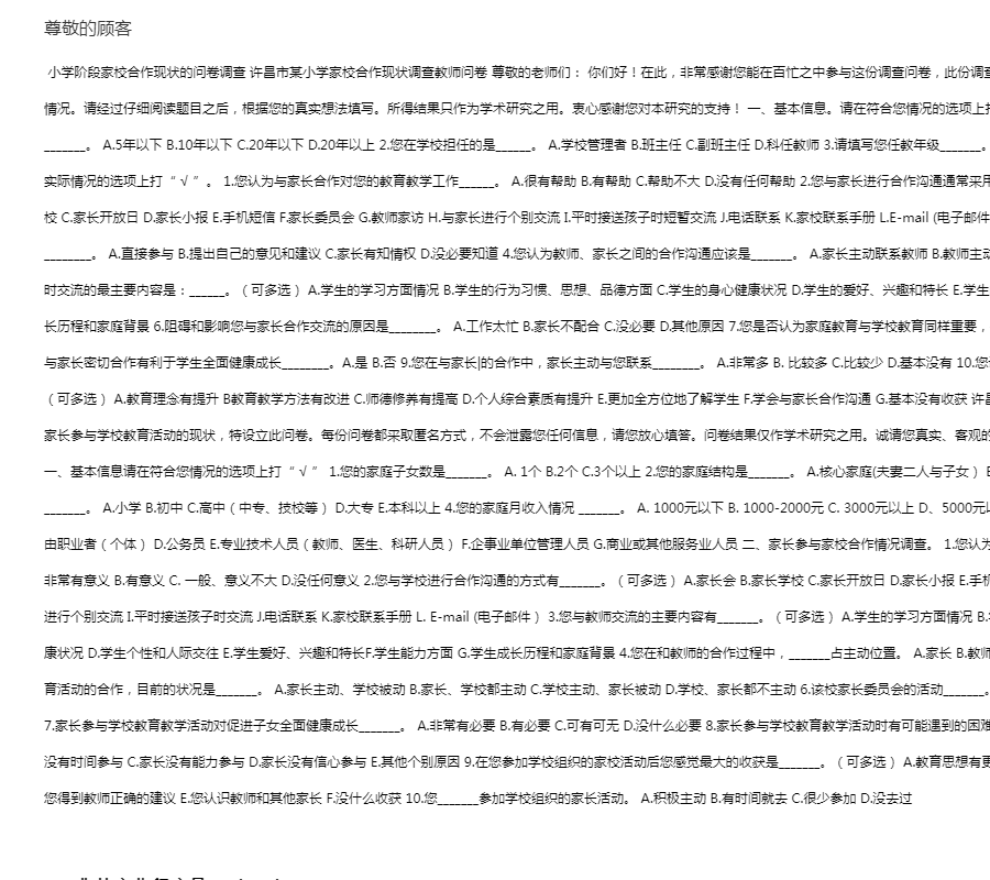 小学阶段家校合作现状调查及对策研究问卷调查 许昌市某小学家校合作现状调查教师问卷 尊敬的老师们: 你们好!在此,非常感谢您能在百忙之中参与这份调查问卷,此份调查问卷的目的在于了解小学家校合作教育方面的情况。请经过仔细阅读题目之后,根据您的真实想法填写。所得结果只作为学术研究之用。衷心感谢您对本研究的支持! 一、基本信息。请在符合您情况的选项上打“ √ ”,或直接填写在横线上1.您的教龄_______。 A.5年以下 B.10年以下 C.20年以下 D.20年以上 2.您在学校担任的是______。 A.学校管理者 B.班主任 C.副班主任 D.科任教师 3.请填写您任教年级_______。 二、教师参与家校合作现状调査。请在符合您实际情况的选项上打“ √ ”。 1.您认为与家长合作对您的教育教学工作______。 A.很有帮助 B.有帮助 C.帮助不大 D.没有任何帮助 2.您与家长进行合作沟通通常釆用的方式有______。(可多选) A.家长会 B.家长学校 C.家长开放日 D.家长小报 E.手机短信 F.家长委员会 G.教师家访 H.与家长进行个别交流 I.平时接送孩子时短暂交流 J.电话联系 K.家校联系手册 L.E-mail (电子邮件) 3.对于学校重大决策的制定,您认为家长________。 A.直接参与 B.提出自己的意见和建议 C.家长有知情权 D.没必要知道 4.您认为教师、家长之间的合作沟通应该是_______。 A.家长主动联系教师 B.教师主动联系家长 C.相互联系 D.定期联系 5.您与家长平时交流的最主要内容是:______。(可多选) A.学生的学习方面情况 B.学生的行为习惯、思想、品德方面 C.学生的身心健康状况 D.学生的爱好、兴趣和特长 E.学生的能力方面 F.学生的个性和人际交往 G.学生的成长历程和家庭背景 6.阻碍和影响您与家长合作交流的原因是________。 A.工作太忙 B.家长不配合 C.没必要 D.其他原因 7.您是否认为家庭教育与学校教育同样重要,需要相互合作________。 A.是 B.否 8.您是否认为与家长密切合作有利于学生全面健康成长________。 A.是 B.否 9.您在与家长|的合作中,家长主动与您联系________。 A.非常多 B. 比较多 C.比较少 D.基本没有 10.您认为在家校合作过程中自己最大的收获________(可多选) A.教育理念有提升 B教育教学方法有改进 C.师德修养有提高 D.个人综合素质有提升 E.更加全方位地了解学生 F.学会与家长合作沟通 G.基本没有收获 许昌市某小学家校合作现状调查家长问卷 为了了解家长参与学校教育活动的现状,特设立此问卷。每份问卷都釆取匿名方式,不会泄露您任何信息,请您放心填答。问卷结果仅作学术研究之用。诚请您真实、客观的填写。对于您对本研究的支持,在此表示感谢! 一、基本信息请在符合您情况的选项上打“ √ ” 1.您的家庭子女数是_______。 A. 1个 B.2个 C.3个以上 2.您的家庭结构是_______。 A.核心家庭(夫妻二人与子女) B. 二代同堂 C.单亲家庭 D.其他 3.您的学历是_______。 A.小学 B.初中 C.高中(中专、技校等) D.大专 E.本科以上 4.您的家庭月收入情况 _______。 A. 1000元以下 B. 1000-2000元 C. 3000元以上 D、5000元以上 5.您的职业是_________。 A.工人 B.农民 C.自由职业者(个体) D.公务员 E.专业技术人员(教师、医生、科研人员) F.企事业单位管理人员 G.商业或其他服务业人员 二、家长参与家校合作情况调查。 1.您认为家长参与学校教育教学活动的合作_______。 A.非常有意义 B.有意义 C. 一般、意义不大 D.没任何意义 2.您与学校进行合作沟通的方式有_______。(可多选) A.家长会 B.家长学校 C.家长开放日 D.家长小报 E.手机短信 F.家长委员会 G.教师家访 H.到学校与教师进行个别交流 I.平时接送孩子时交流 J.电话联系 K.家校联系手册 L. E-mail (电子邮件) 3.您与教师交流的主要内容有_______。(可多选) A.学生的学习方面情况 B.学生的行为习惯、思想、道德方面 C.学生身体健康状况 D.学生个性和人际交往 E.学生爱好、兴趣和特长F.学生能力方面 G.学生成长历程和家庭背景 4.您在和教师的合作过程中,_______占主动位置。 A.家长 B.教师 C.家长与教师 D.不清楚 5.对于家长参与学校教育活动的合作,目前的状况是_______。 A.家长主动、学校被动 B.家长、学校都主动 C.学校主动、家长被动 D.学校、家长都不主动 6.该校家长委员会的活动_______。 A.经常举行 B.每年一次 C.每学期一次 D.不清楚 7.家长参与学校教育教学活动对促进子女全面健康成长_______。 A.非常有必要 B.有必要 C.可有可无 D.没什么必要 8.家长参与学校教育教学活动时有可能遇到的困难,您认为是_______。 A.家长不愿意参与 B.家长没有时间参与 C.家长没有能力参与 D.家长没有信心参与 E.其他个别原因 9.在您参加学校组织的家校活动后您感觉最大的收获是_______。(可多选) A.教育思想有更新 B.教育方法有改进 C.对孩子的认识有提升 D.您得到教师正确的建议 E.您认识教师和其他家长 F.没什么收获 10.您_______参加学校组织的家长活动。 A.积极主动 B.有时间就去 C.很少参加 D.没去过
