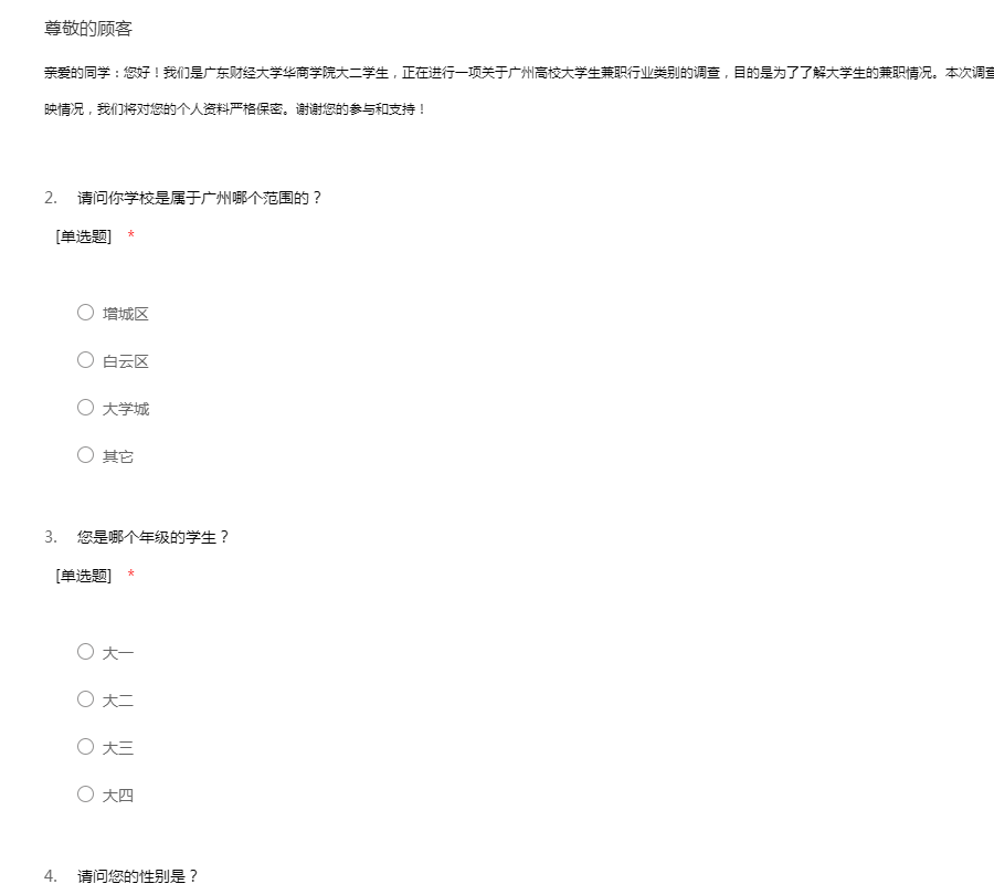 亲爱的同学:您好!我们是广东财经大学华商学院大二学生,正在进行一项关于广州高校大学生兼职行业类别的调查,目的是为了了解大学生的兼职情况。本次调查不记名字,您的调查无所谓对错,只需要如实反映情况,我们将对您的个人资料严格保密。谢谢您的参与和支持!