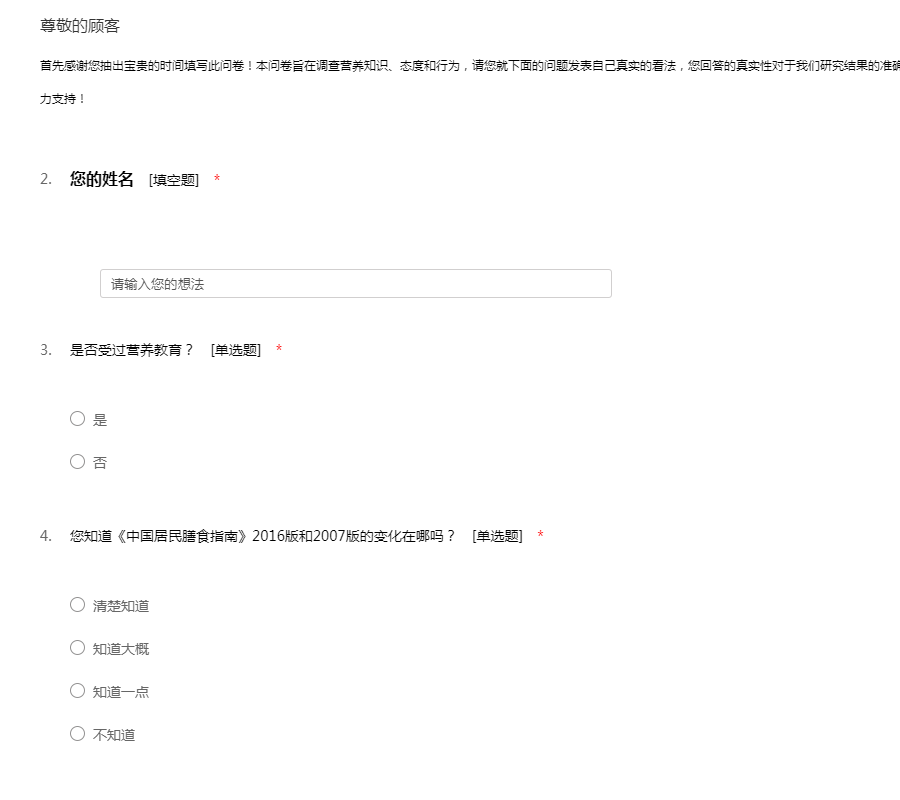 首先感谢您抽出宝贵的时间填写此问卷!本问卷旨在调查营养知识、态度和行为,请您就下面的问题发表自己真实的看法,您回答的真实性对于我们研究结果的准确性十分重要。再次衷心地感谢您对我们调查的大力支持!