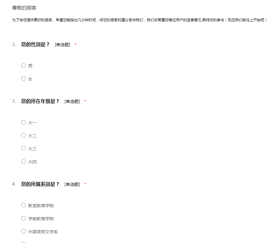 为了给您提供更好的服务,希望您能抽出几分钟时间,将您的感受和建议告诉我们,我们非常重视每位用户的宝贵意见,期待您的参与!现在我们就马上开始吧!