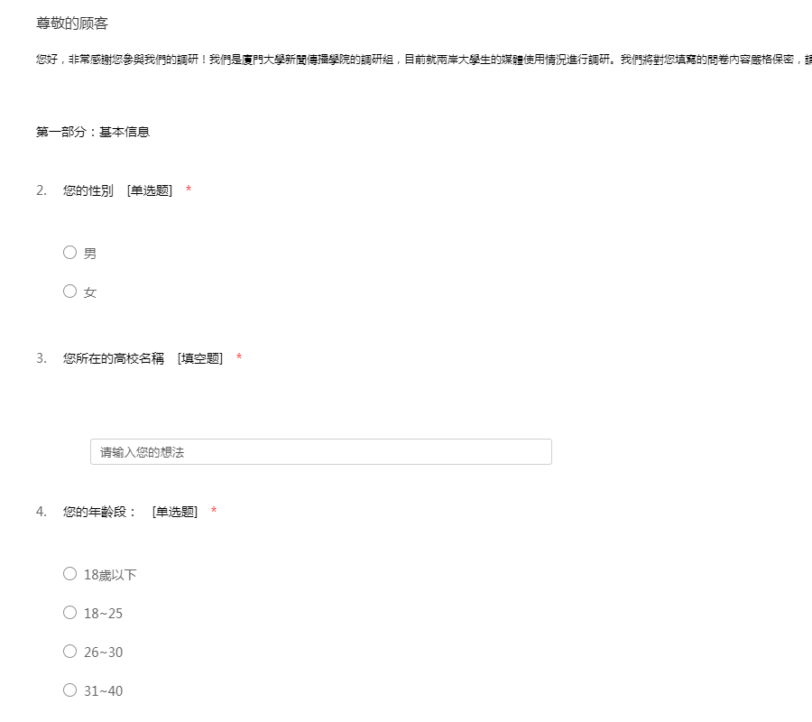 您好,非常感謝您參與我們的調研!我們是廈門大學新聞傳播學院的調研組,目前就兩岸大學生的媒體使用情況進行調研。我們將對您填寫的問卷內容嚴格保密,請您放心填寫。