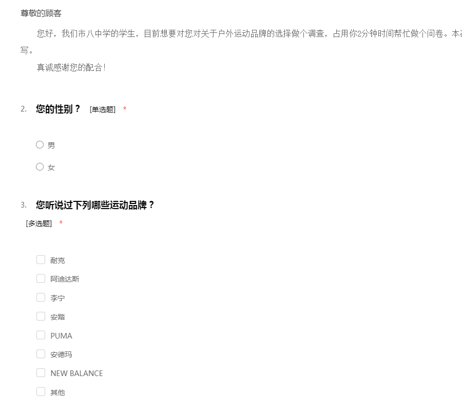 您好,我们市八中学的学生,目前想要对您对关于户外运动品牌的选择做个调查,占用你2分钟时间帮忙做个问卷。本次调查采用无记名方式,可以放心填写。真诚感谢您的配合!