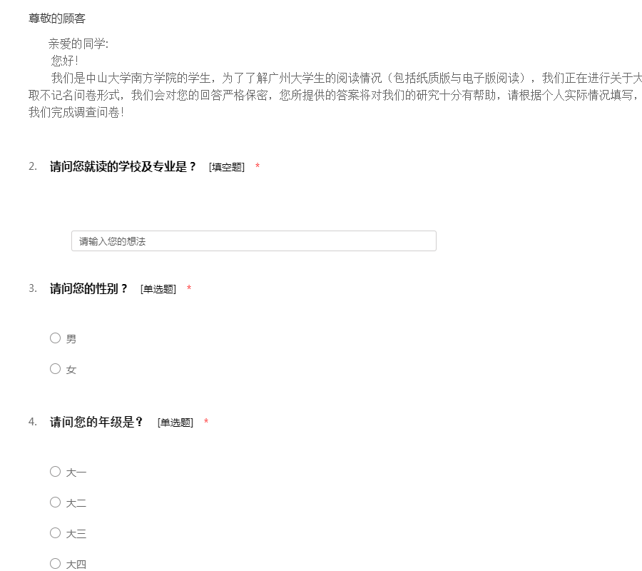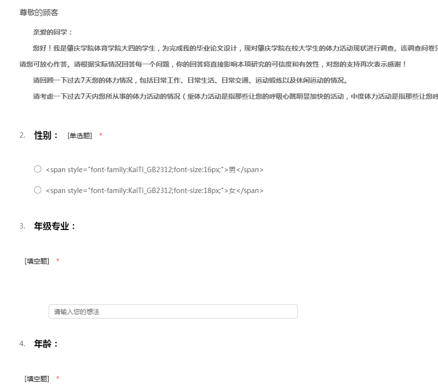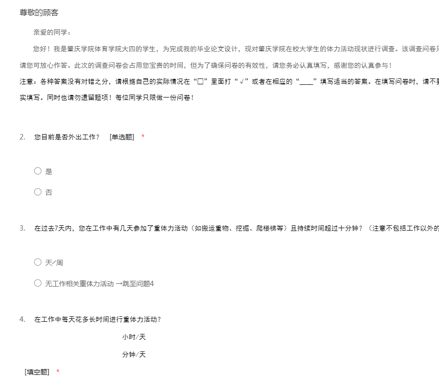 您好!我是肇庆学院体育学院大四的学生,为完成我的毕业论文设计,现对肇庆学院在校大学生的体力活动现状进行调查。该调查问卷只供课题研究之用,我将严格为您保密,请您可放心作答。请根据实际情况回答每一个问题,你的回答将直接影响本项研究的可信度和有效性,对您的支持再次表示感谢!