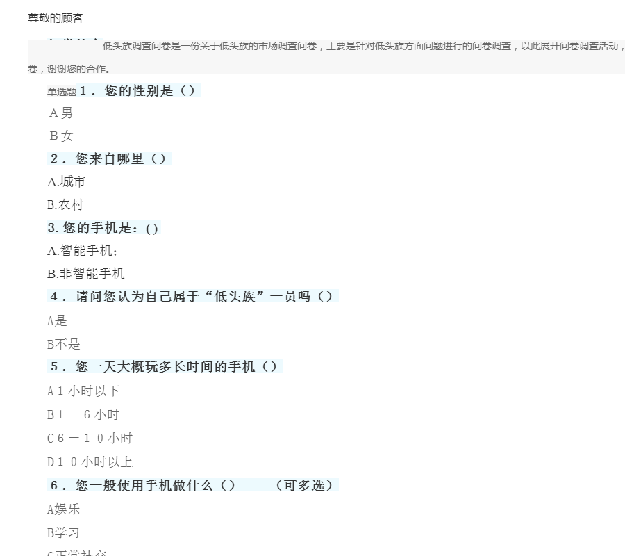 问卷简介低头族调查问卷是一份关于低头族的市场调查问卷,主要是针对低头族方面问题进行的问卷调查,以此展开问卷调查活动,耽误您一些宝贵时间,回答低头族调查问卷,谢谢您的合作。