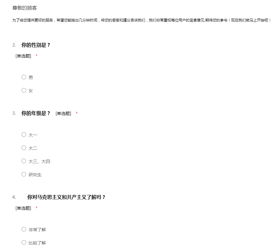 感谢大家在百忙之中抽出时间,这是一份了解当代大学生社会主义核心价值观现状的调查问卷。为保护您的隐私,问卷采取匿名调查的方式,所以希望您能真实填写问卷。再次感谢您的配合!