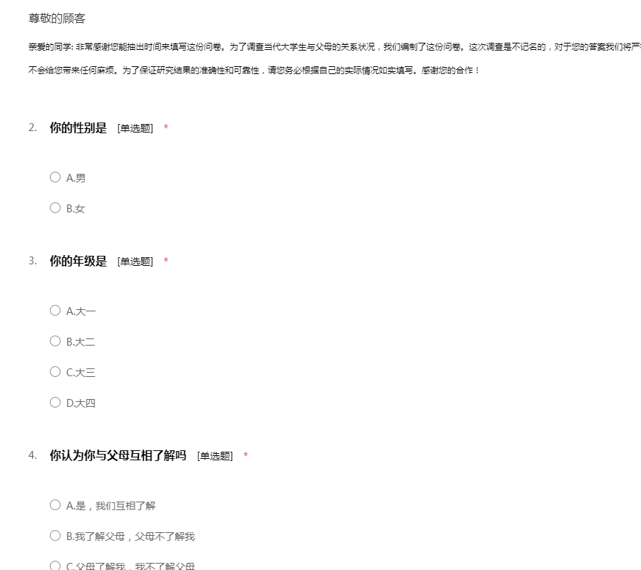 亲爱的同学: 非常感谢您能抽出时间来填写这份问卷。为了调查当代大学生与父母的关系状况,我们编制了这份问卷。这次调查是不记名的,对于您的答案我们将严格保密。调查所得的一切数据只用于研究分析,不会给您带来任何麻烦。为了保证研究结果的准确性和可靠性,请您务必根据自己的实际情况如实填写。感谢您的合作!