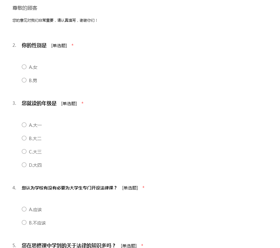 您好!耽误您几分钟的时间,为了解大学生法律意识做以下调查,此调查不涉及个人隐私,对您在百忙之中抽时间参与调查,深表感谢!