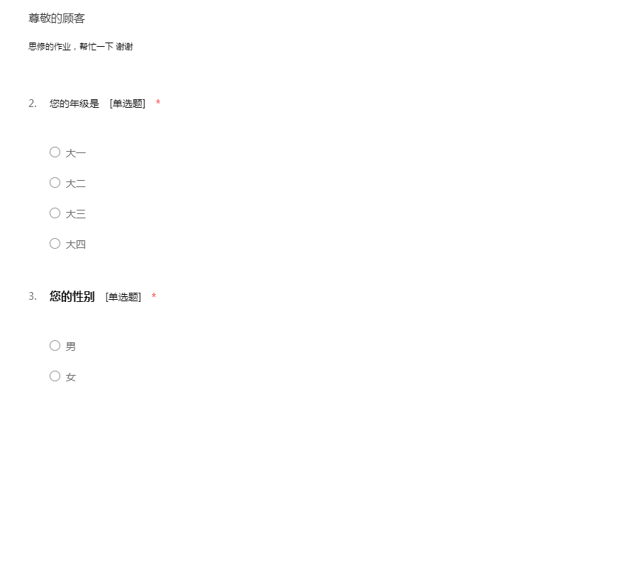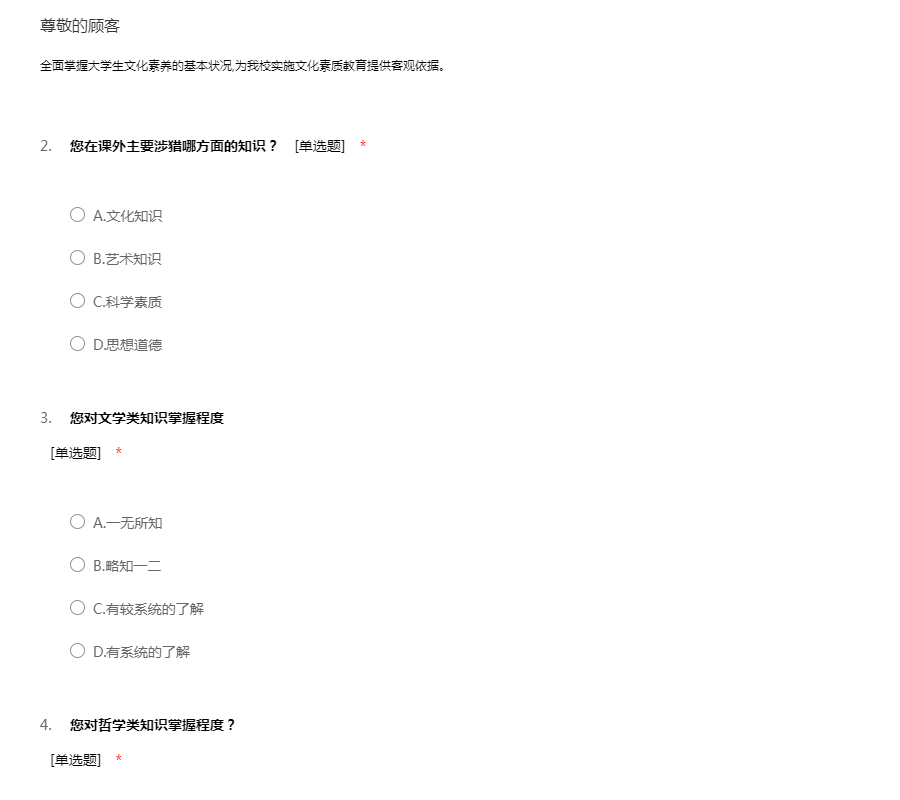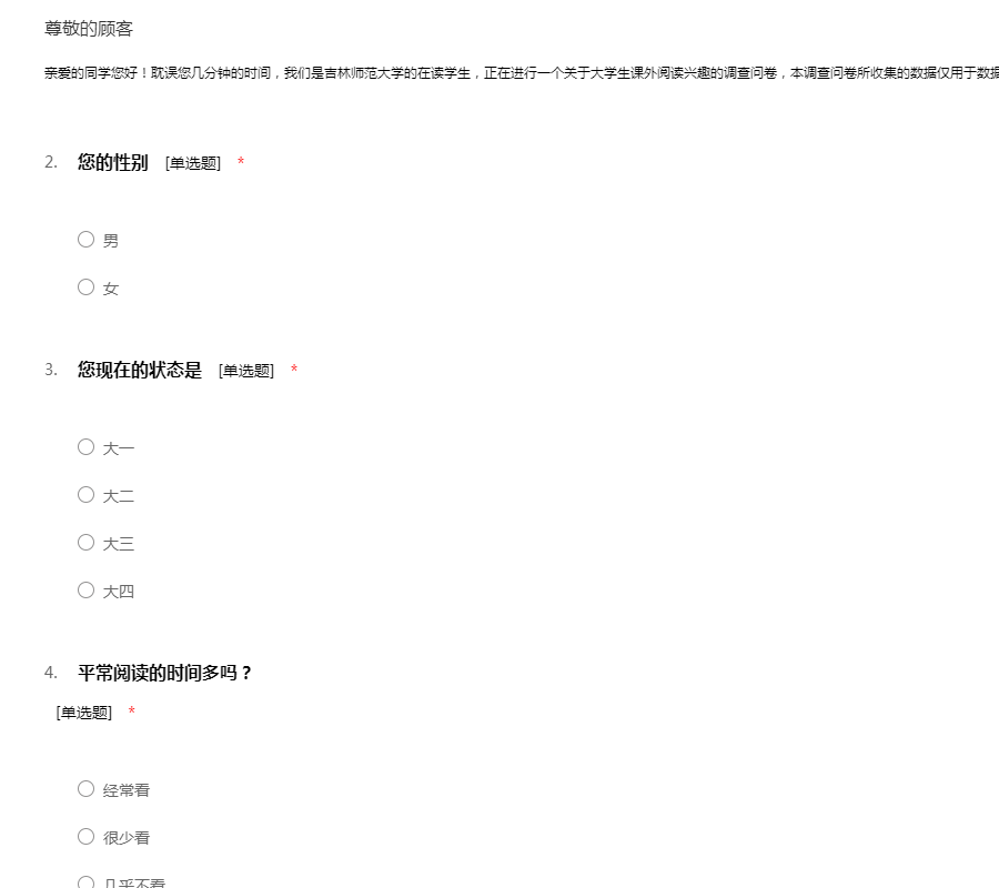 亲爱的同学您好!耽误您几分钟的时间,我们是吉林师范大学的在读学生,正在进行一个关于大学生课外阅读兴趣的调查问卷,本调查问卷所收集的数据仅用于数据分析,不做其他用途,再次感谢您的支持!