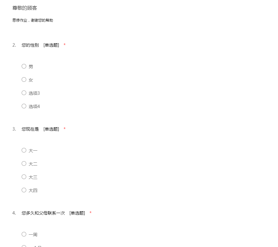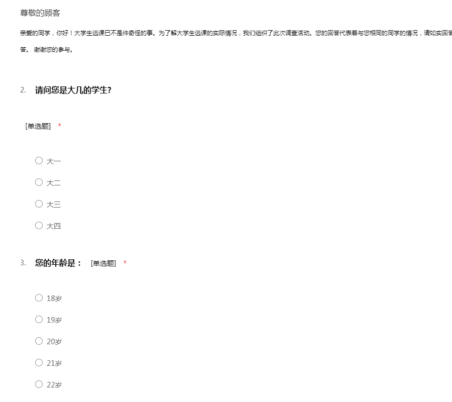 亲爱的同学,你好!大学生逃课已不是件奇怪的事。为了解大学生逃课的实际情况,我们组织了此次调查活动。您的回答代表着与您相同的同学的情况,请如实回答。所有回答资料都只用于统计分析,请您如实回答。 谢谢您的参与。