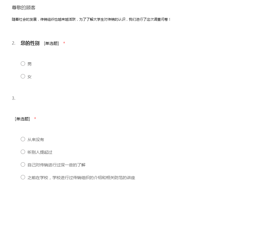 随着社会的发展,传销组织也越来越活跃,为了了解大学生对传销的认识,我们进行了这次调查问卷!