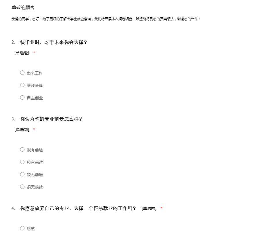亲爱的同学,您好!为了更好的了解大学生就业意向,我们特开展本次问卷调查,希望能得到您的真实想法,谢谢您的合作!