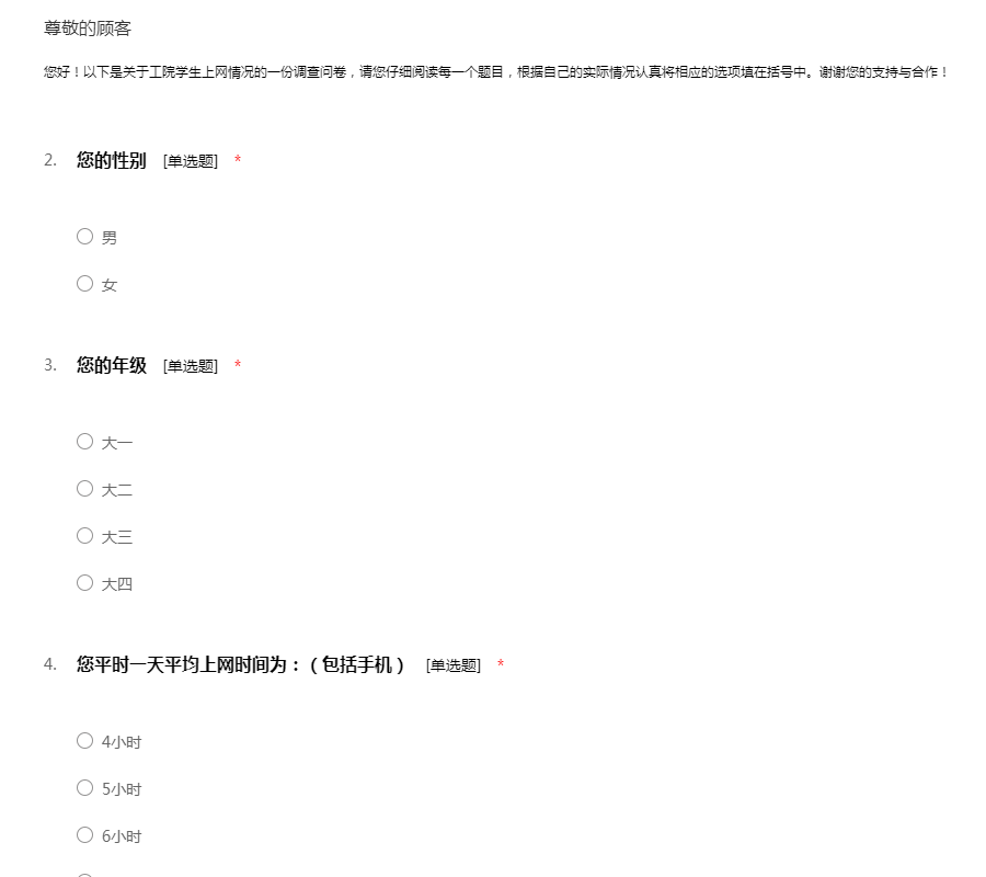 您好!以下是关于工院学生上网情况的一份调查问卷,请您仔细阅读每一个题目,根据自己的实际情况认真将相应的选项填在括号中。谢谢您的支持与合作!
