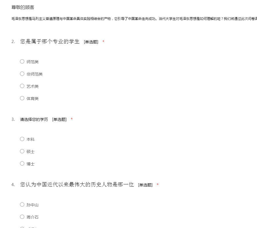 毛泽东思想是马列主义普遍原理与中国革命具体实践相结合的产物,它引导了中国革命走向成功。当代大学生对毛泽东思想是如何理解的呢?我们将通过此次问卷调查获取答案。