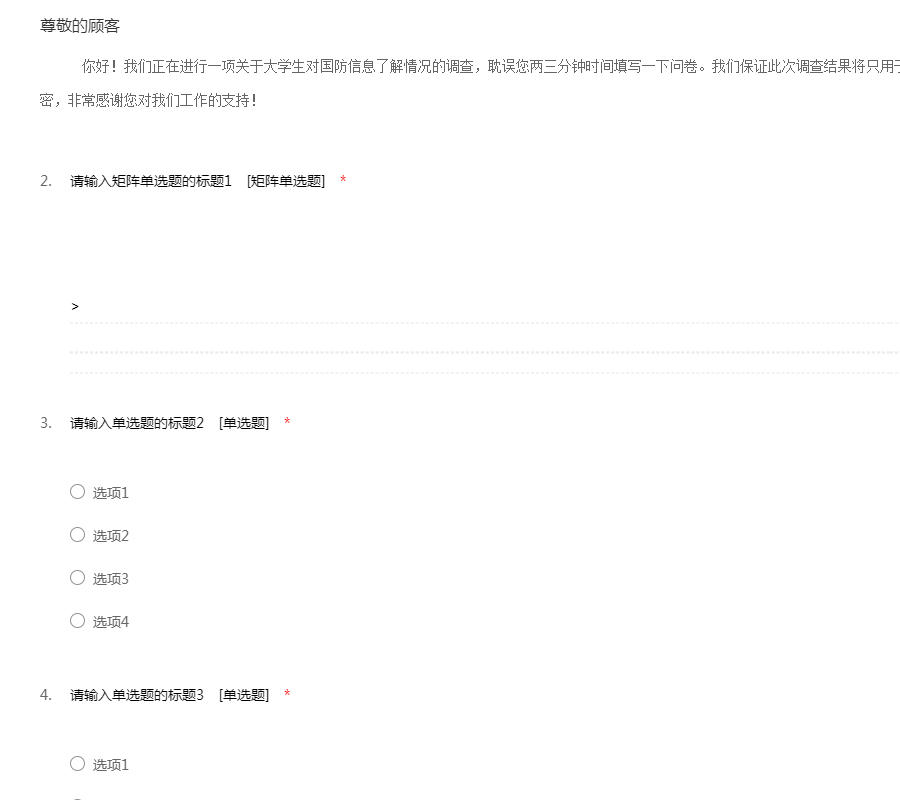 你好!我们正在进行一项关于大学生对国防信息了解情况的调查,耽误您两三分钟时间填写一下问卷。我们保证此次调查结果将只用于课题 研究,并将对您的个人信息完全保密,非常感谢您对我们工作的支持!