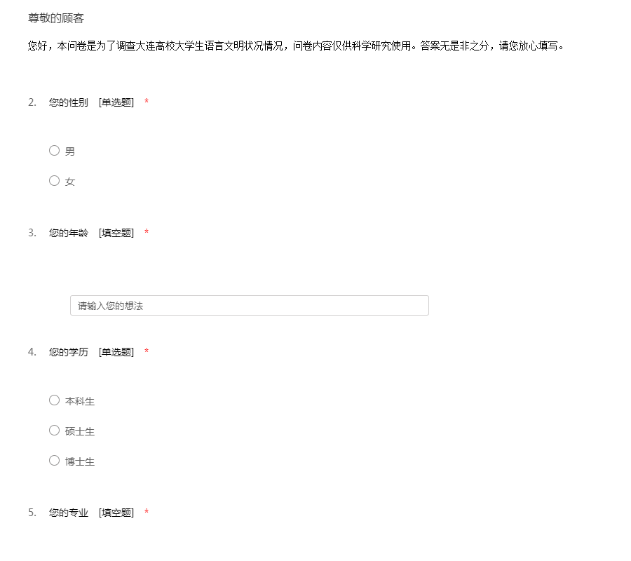 您好,本问卷是为了调查大连高校大学生语言文明状况情况,问卷内容仅供科学研究使用。答案无是非之分,请您放心填写。