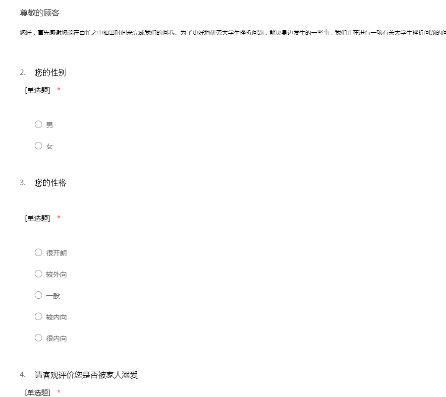您好,首先感谢您能在百忙之中抽出时间来完成我们的问卷。为了更好地研究大学生挫折问题,解决身边发生的一些事,我们正在进行一项有关大学生挫折问题的问卷调查。