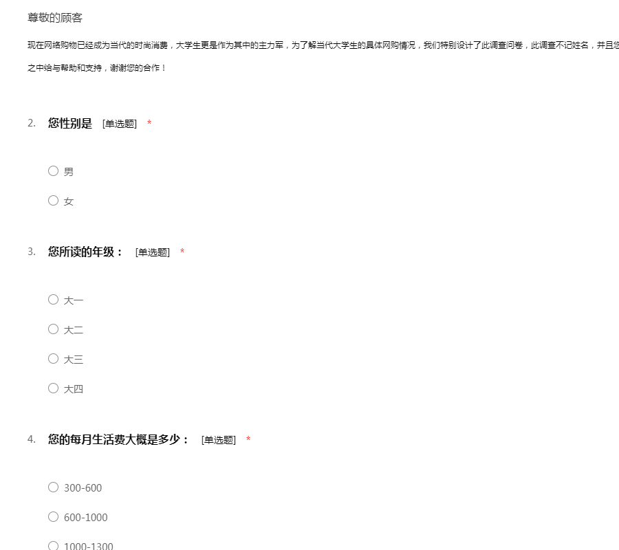 现在网络购物已经成为当代的时尚消费,大学生更是作为其中的主力军,为了解当代大学生的具体网购情况,我们特别设计了此调查问卷,此调查不记姓名,并且您所提供的数据将只用于统计分析,麻烦您在百忙之中给与帮助和支持,谢谢您的合作!