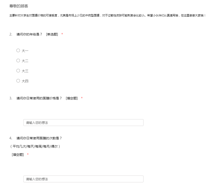主要针对大学生对面膜价格的可接受度,尤其是市场上少见的中药型面膜,对于过敏性皮肤可能刺激会比较小。希望小伙伴们认真填写哦,在这里谢谢大家哦!