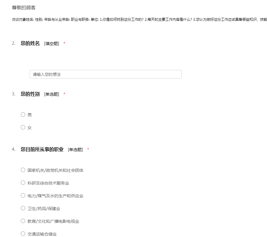 访谈对象姓名: 性别: 年龄与从业年龄: 职业与职务: 单位: 1.你是如何找到这份工作的? 2.每天的主要工作内容是什么? 3.您认为做好这份工作应该具备哪些知识、技能和经验?